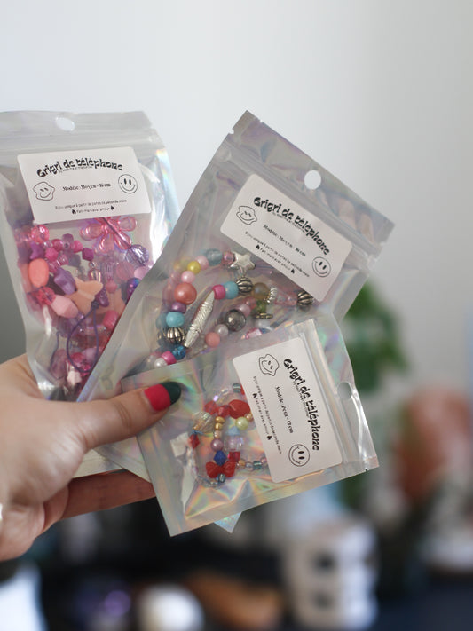 Tous nos bijoux de téléphone sont fait à partir de perles et de matériaux de seconde main. De ce fait, chaque bijou est unique.