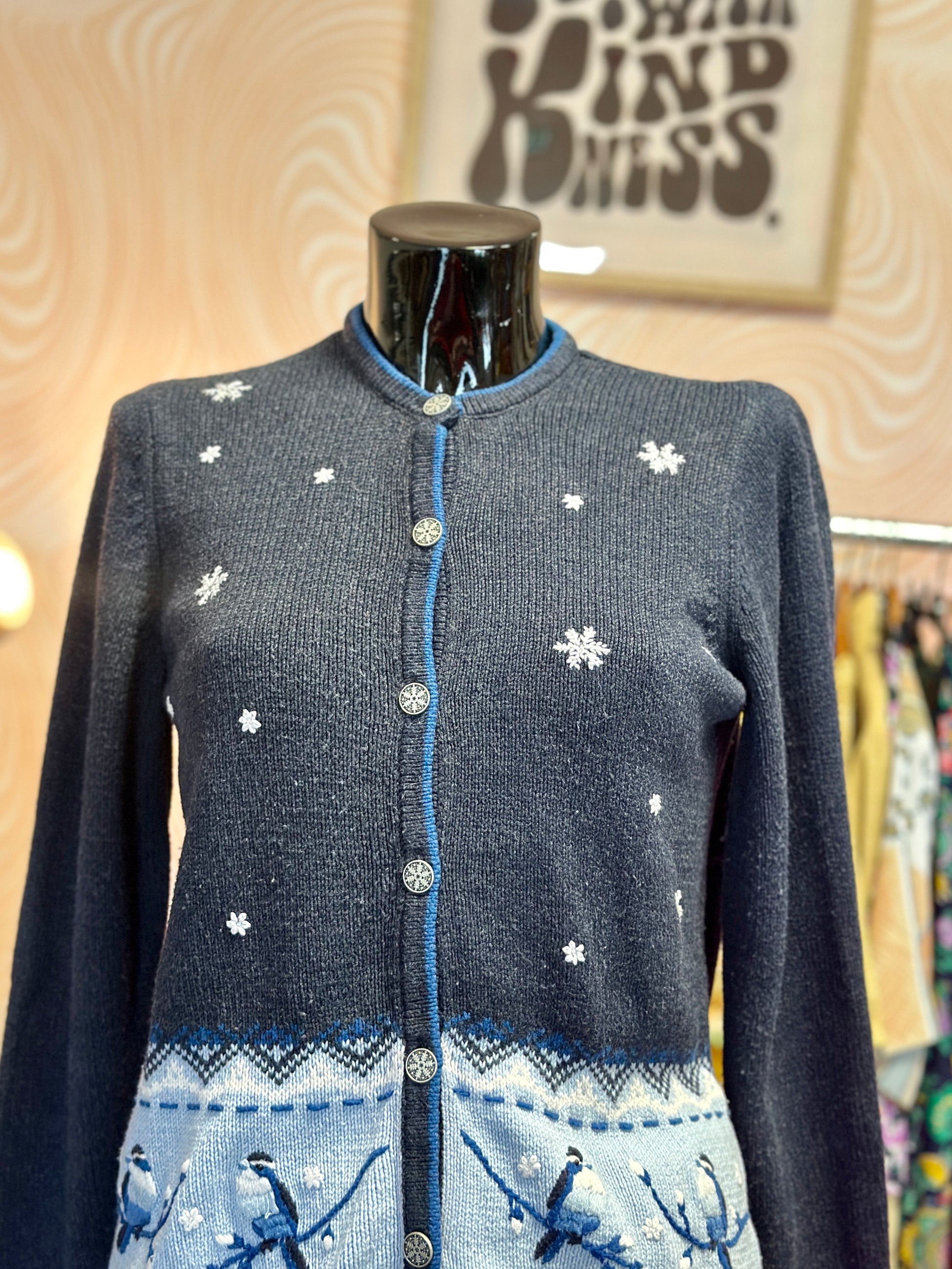 Cardigan vintage, années 90, avec des flocons et petits oiseaux brodés. Ainsi que des perles et des sequins.