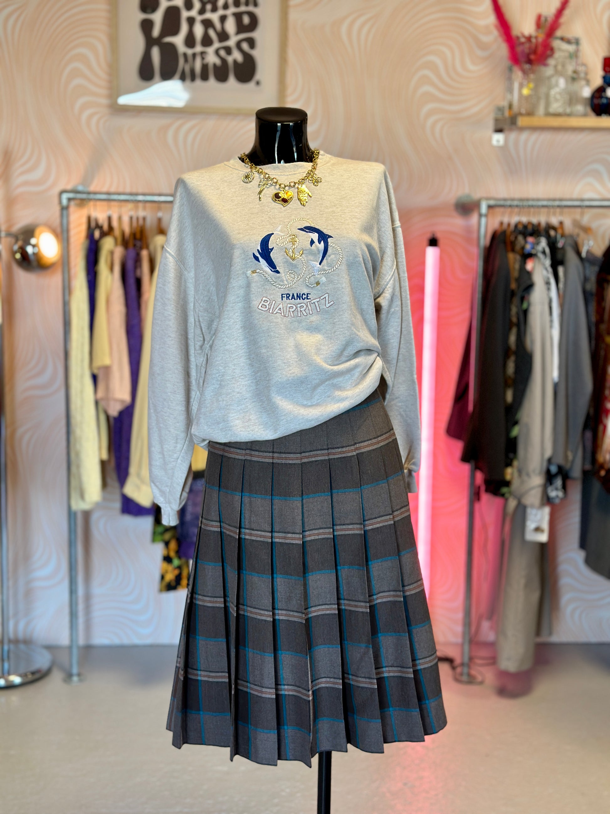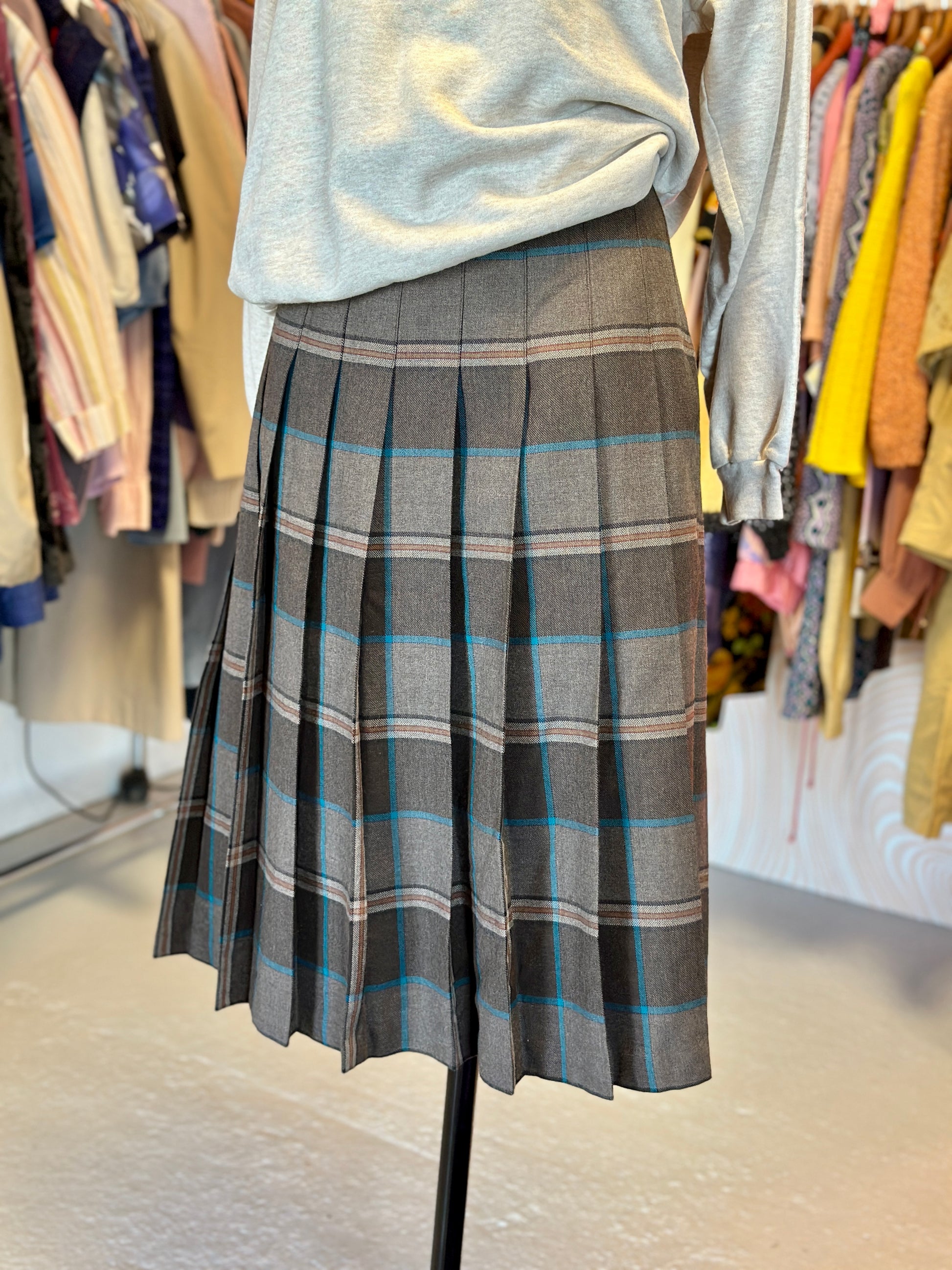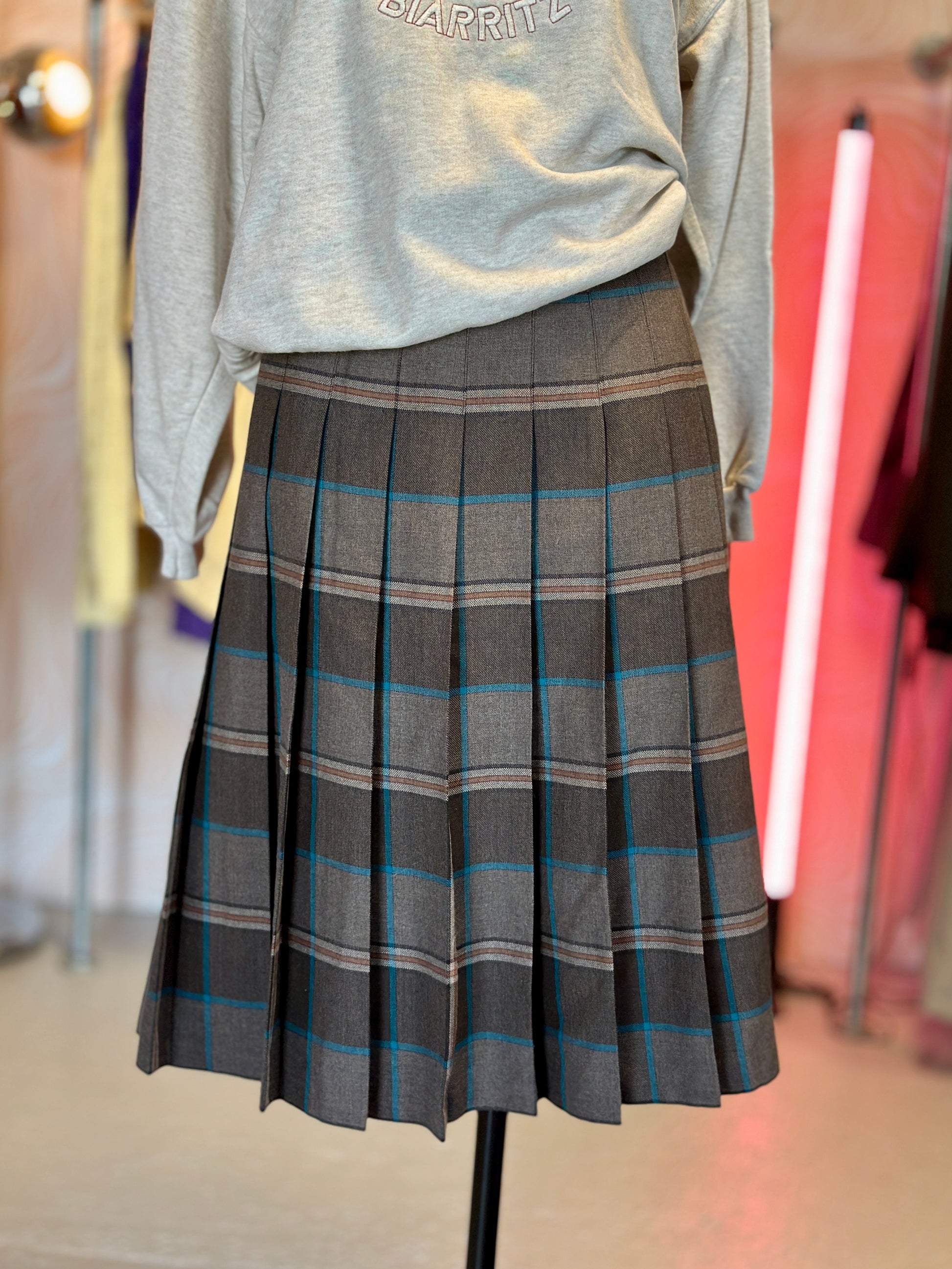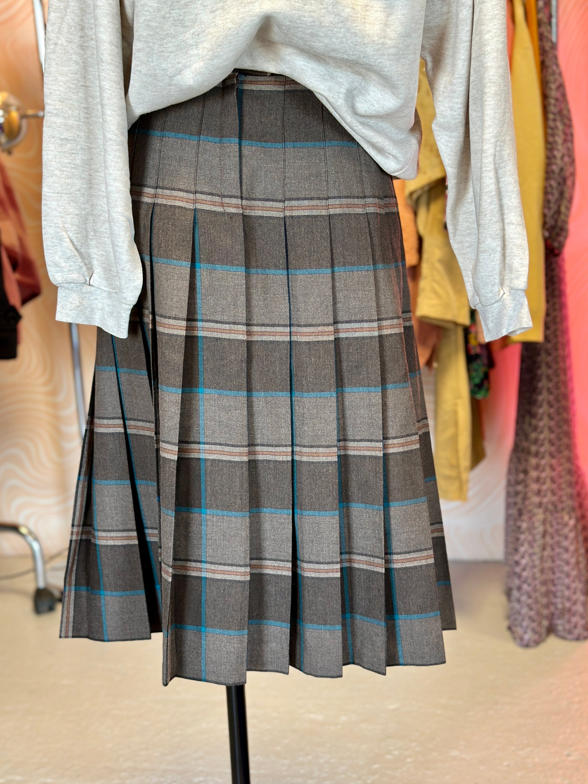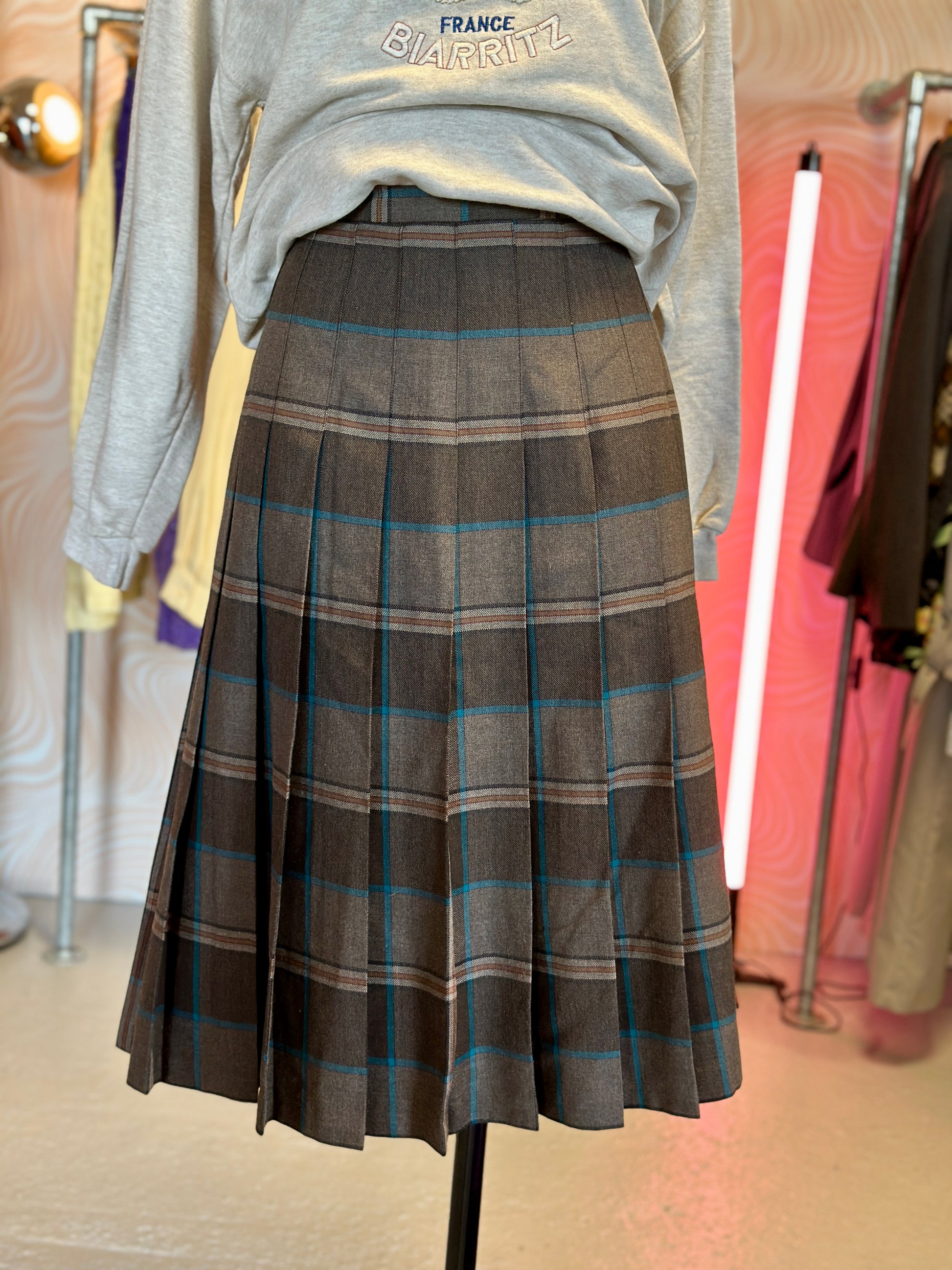 Jupe mi-longue vintage, plissée marron à carreaux.