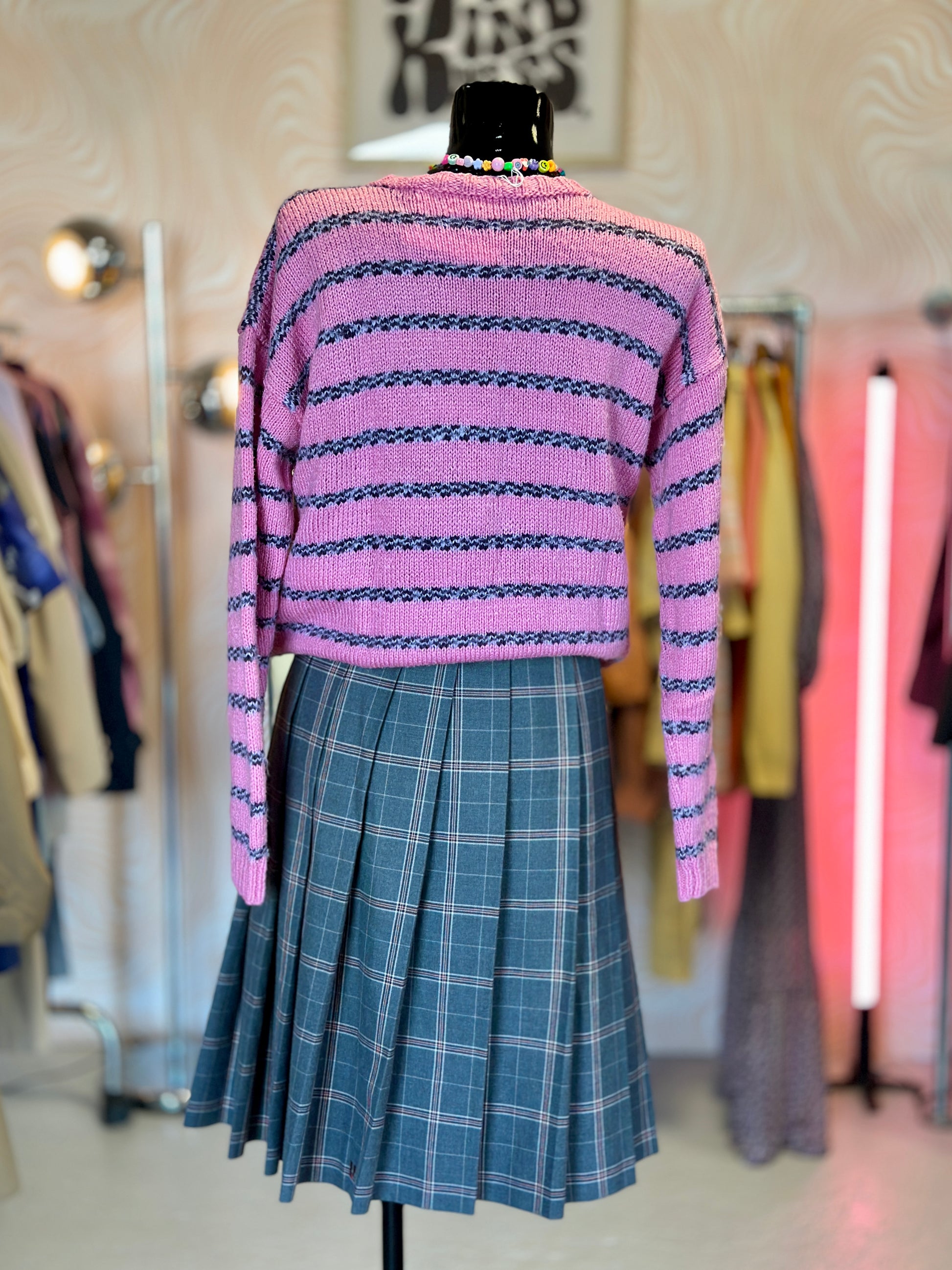 Pull rose à rayures, bien douillet.