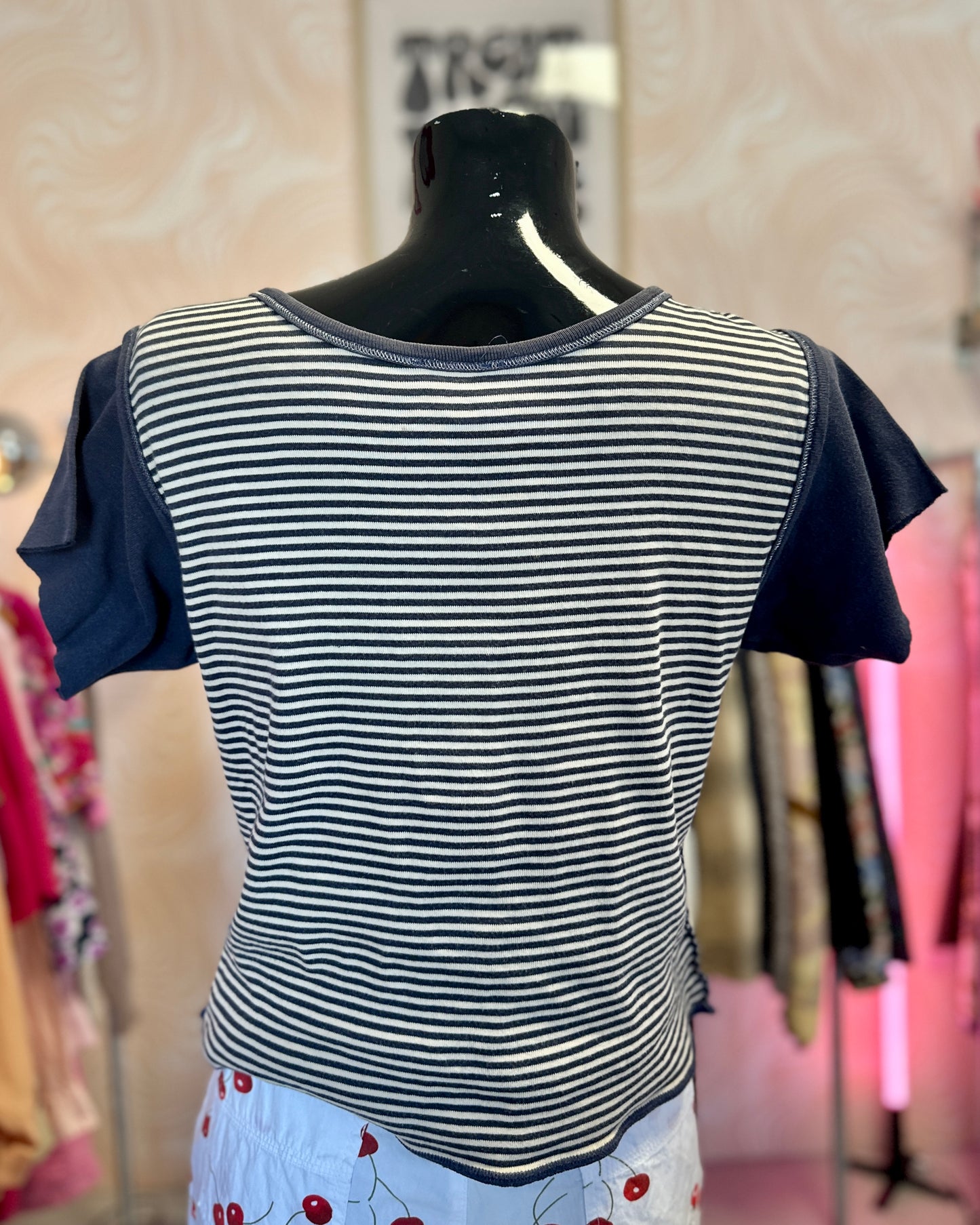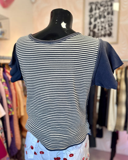 T-shirt court, effet à l'envers avec ses coutures apparentes.