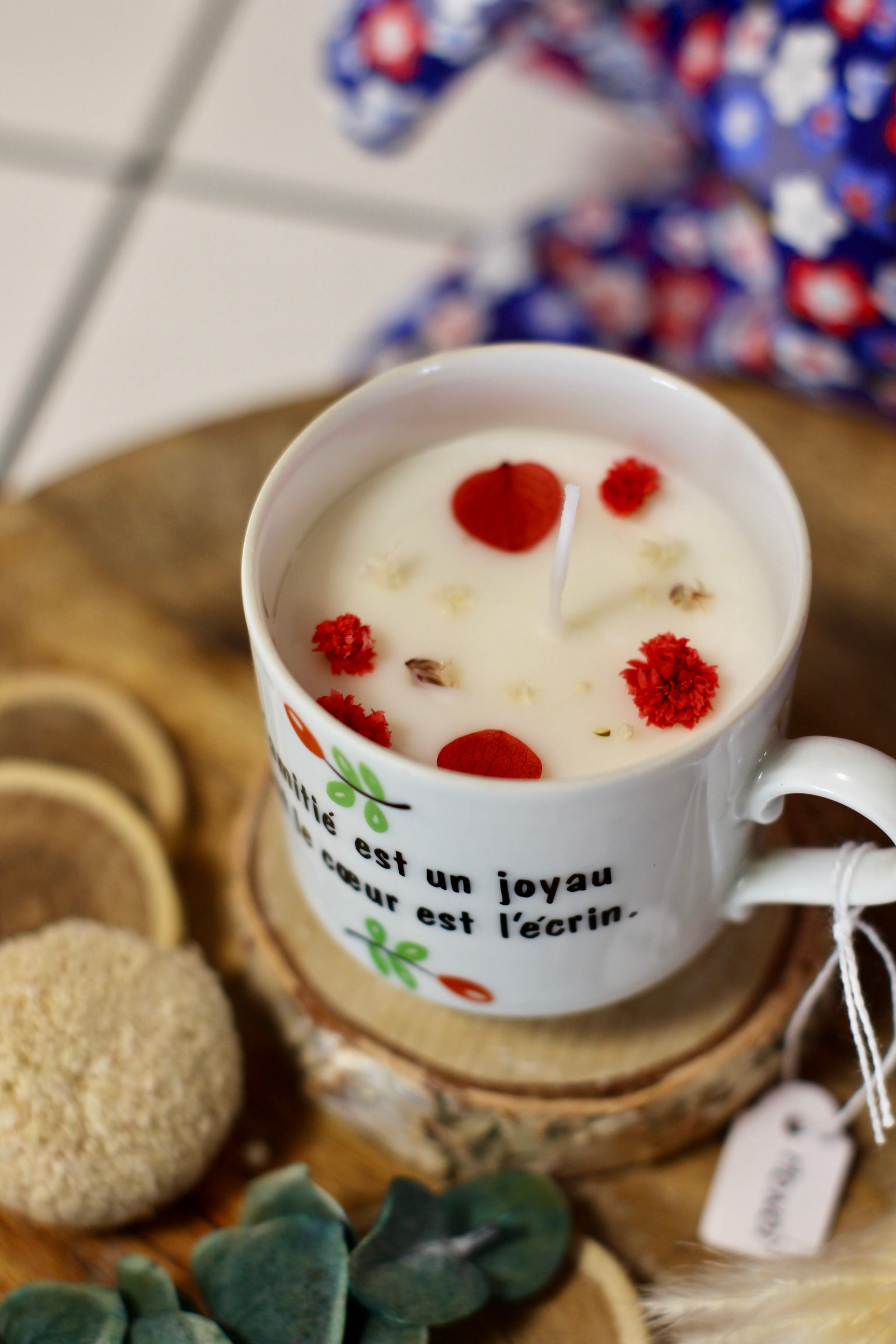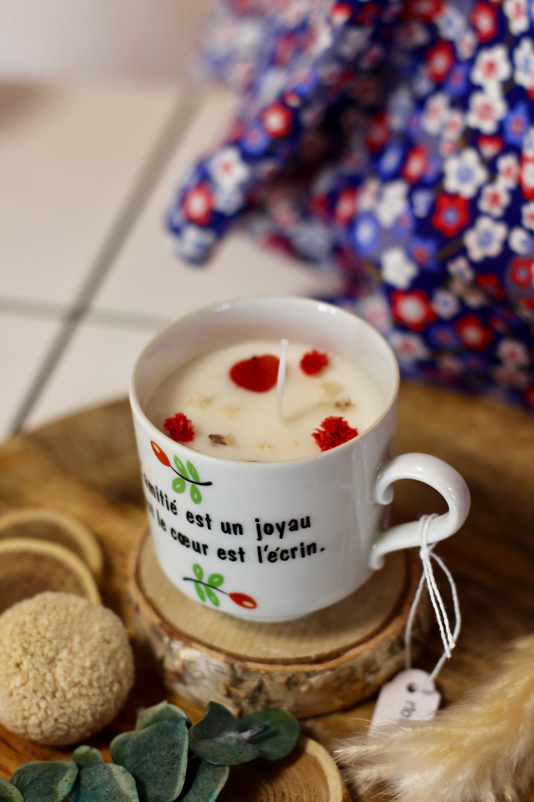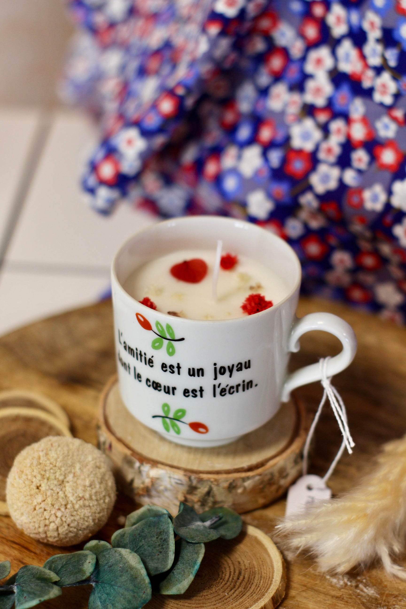 Bougie dans une tasse vintage en porcelaine, avec un joli mantra pour offrir à ta bff.