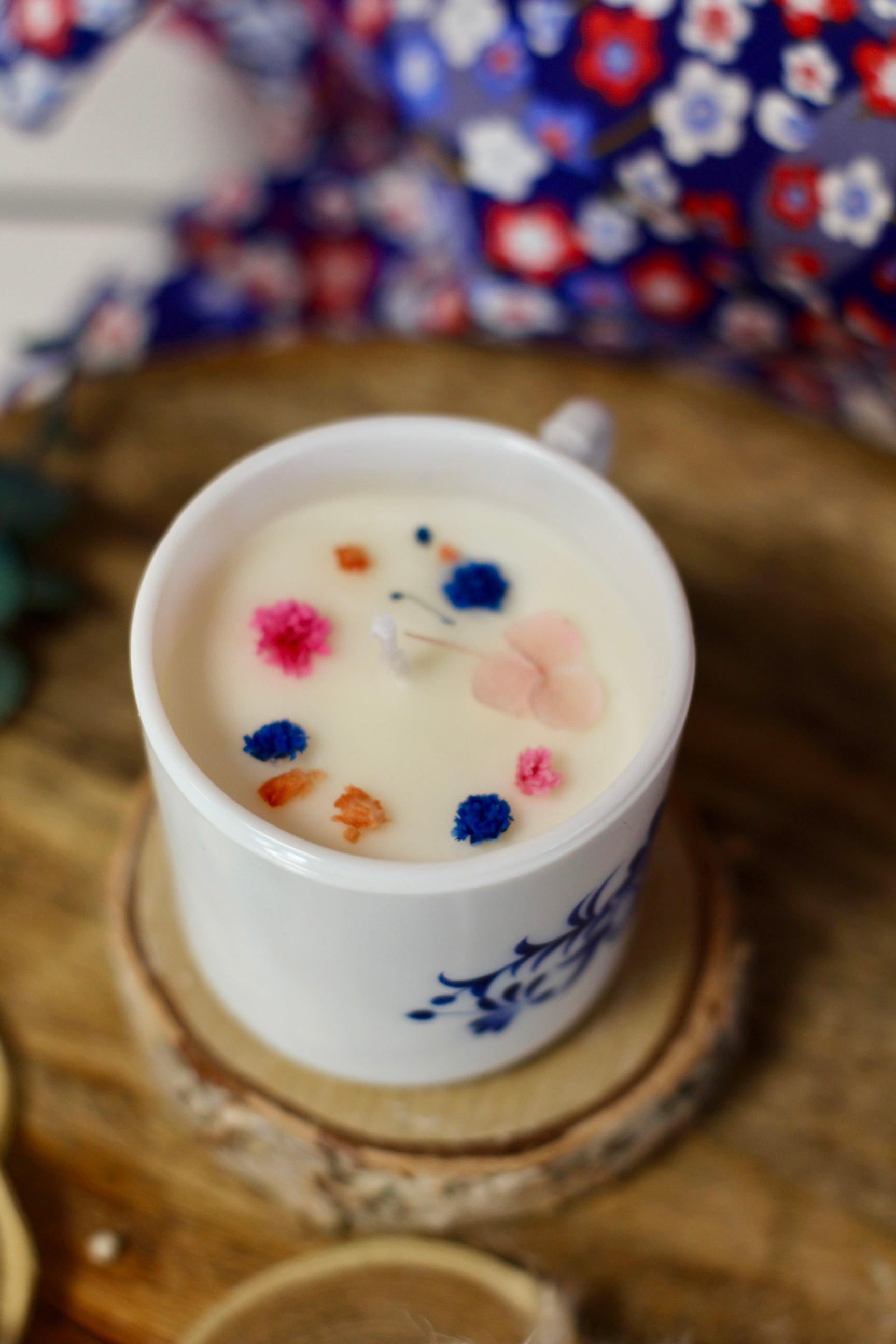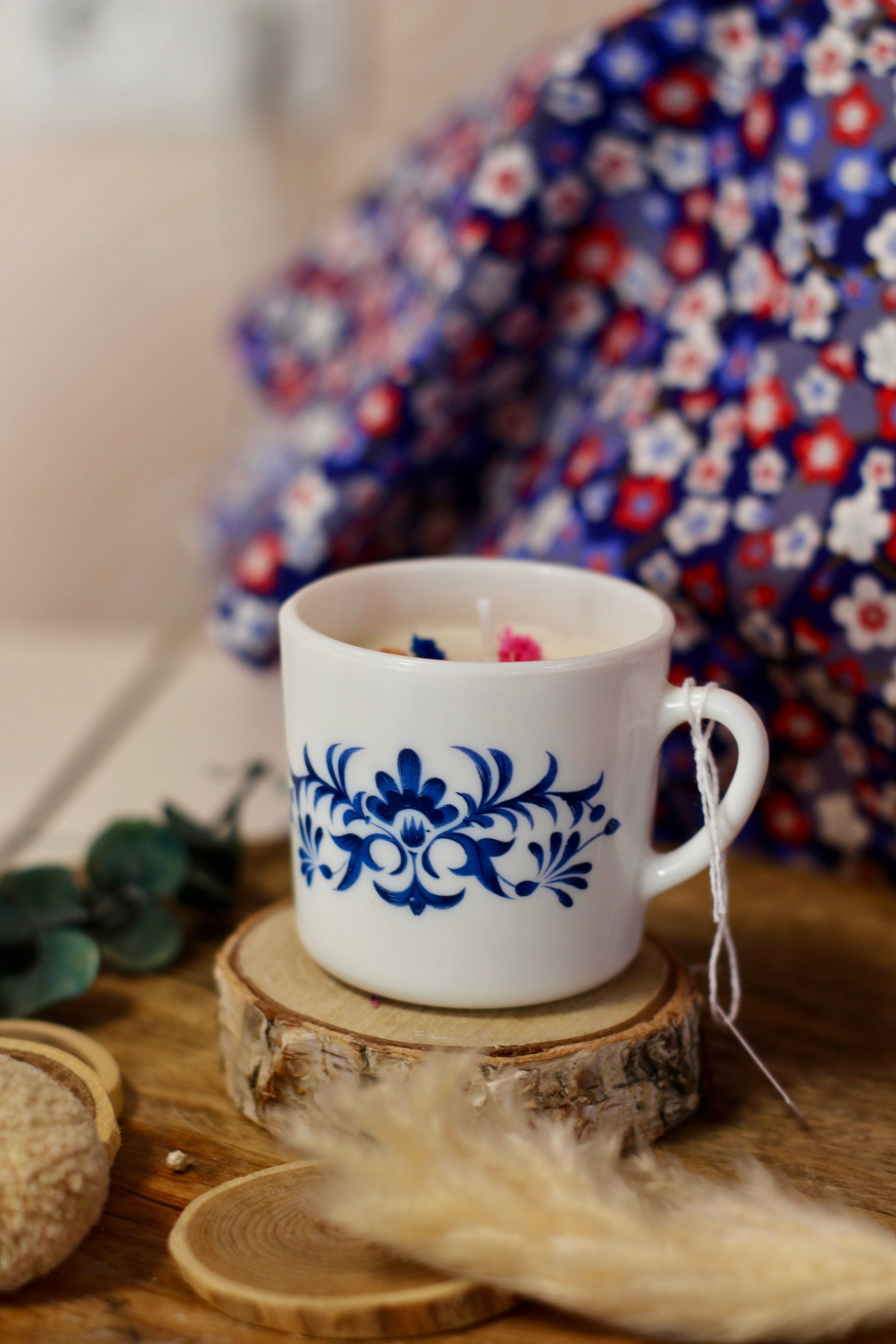 Bougie dans une petite tasse vintage. Elle est composée de fleurs roses et bleues.