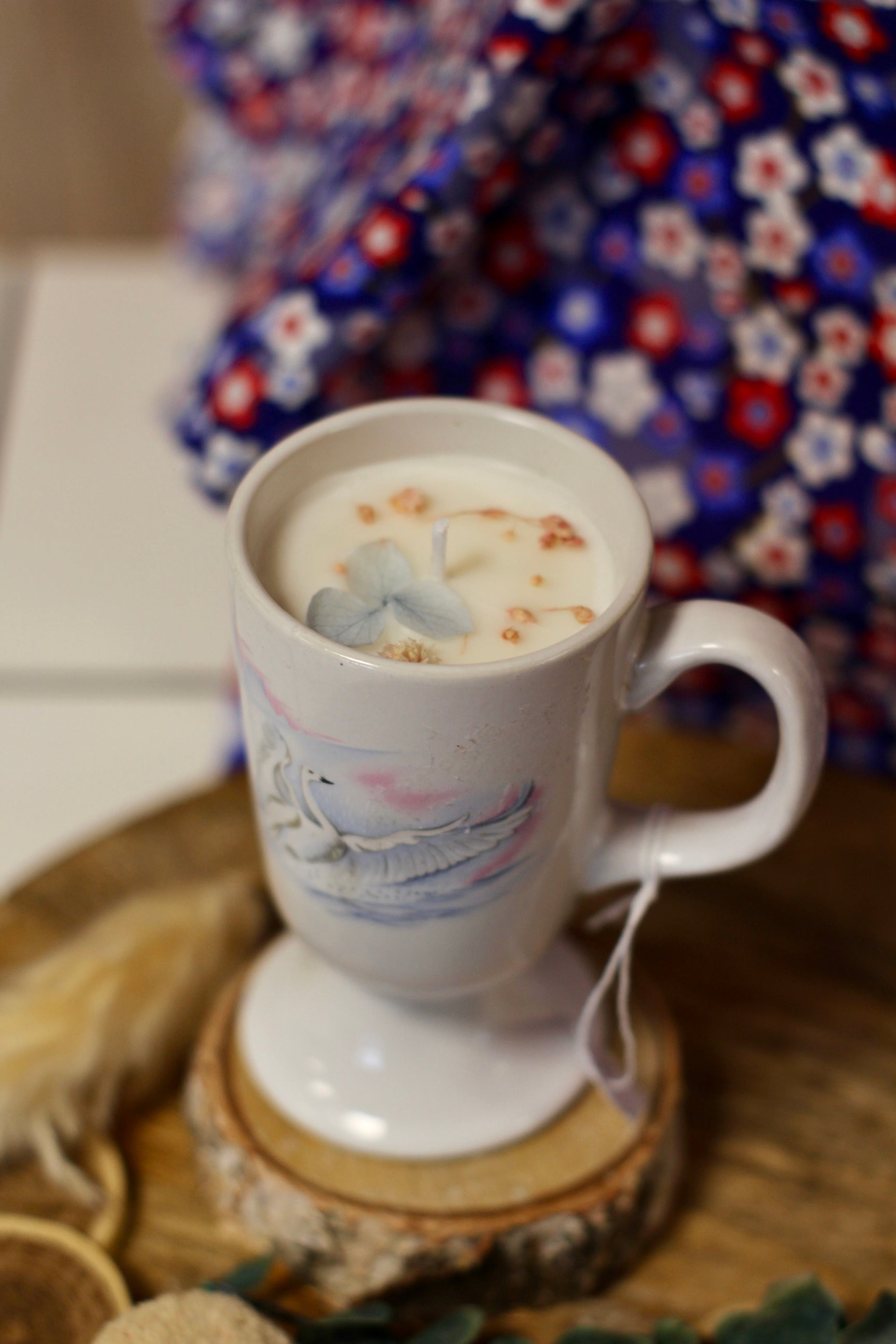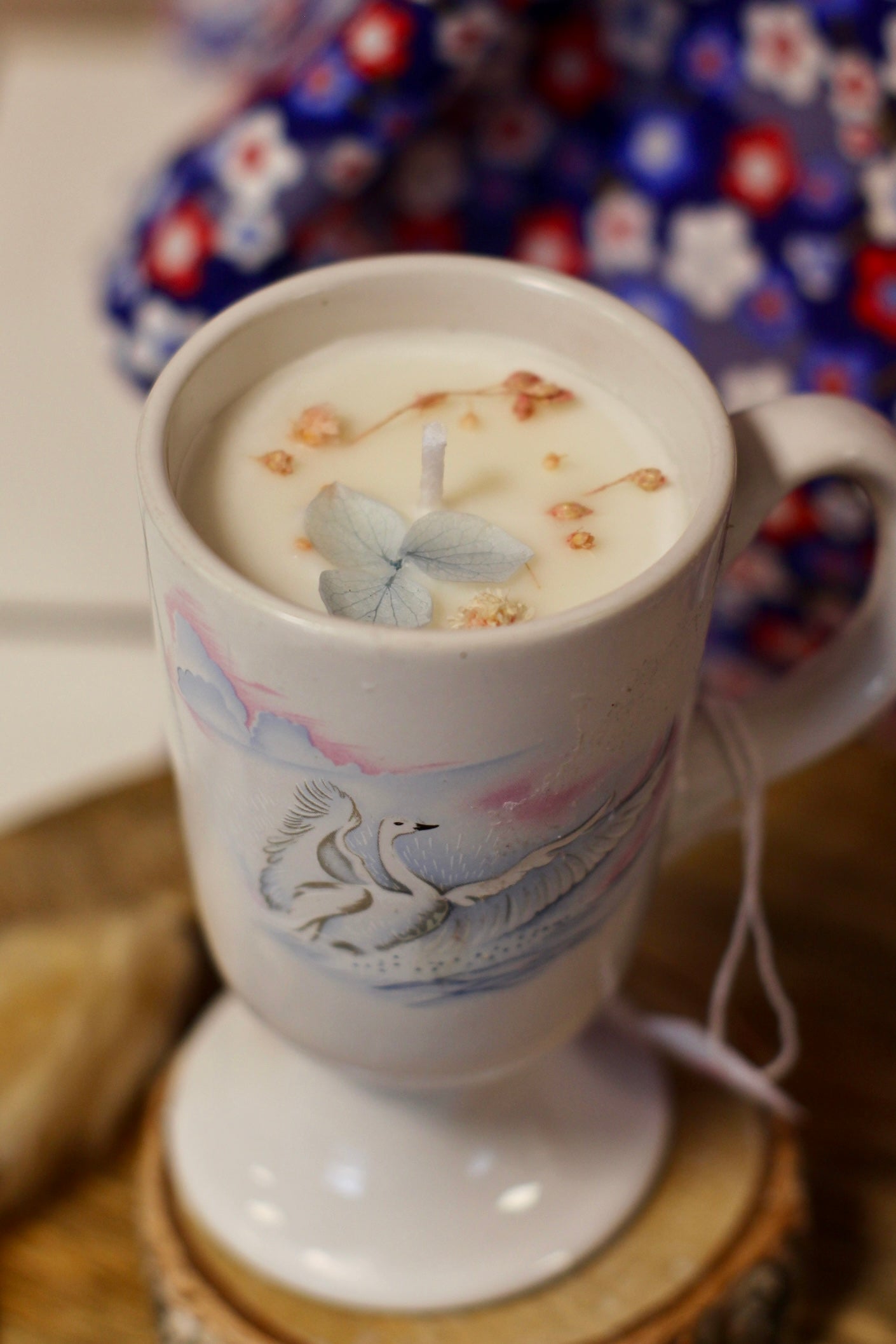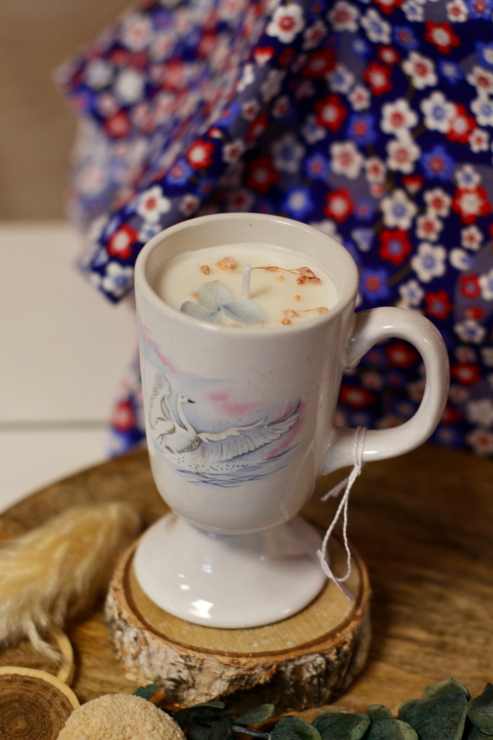 Bougie dans un mazagran vintage avec un sublime motif de cygne.