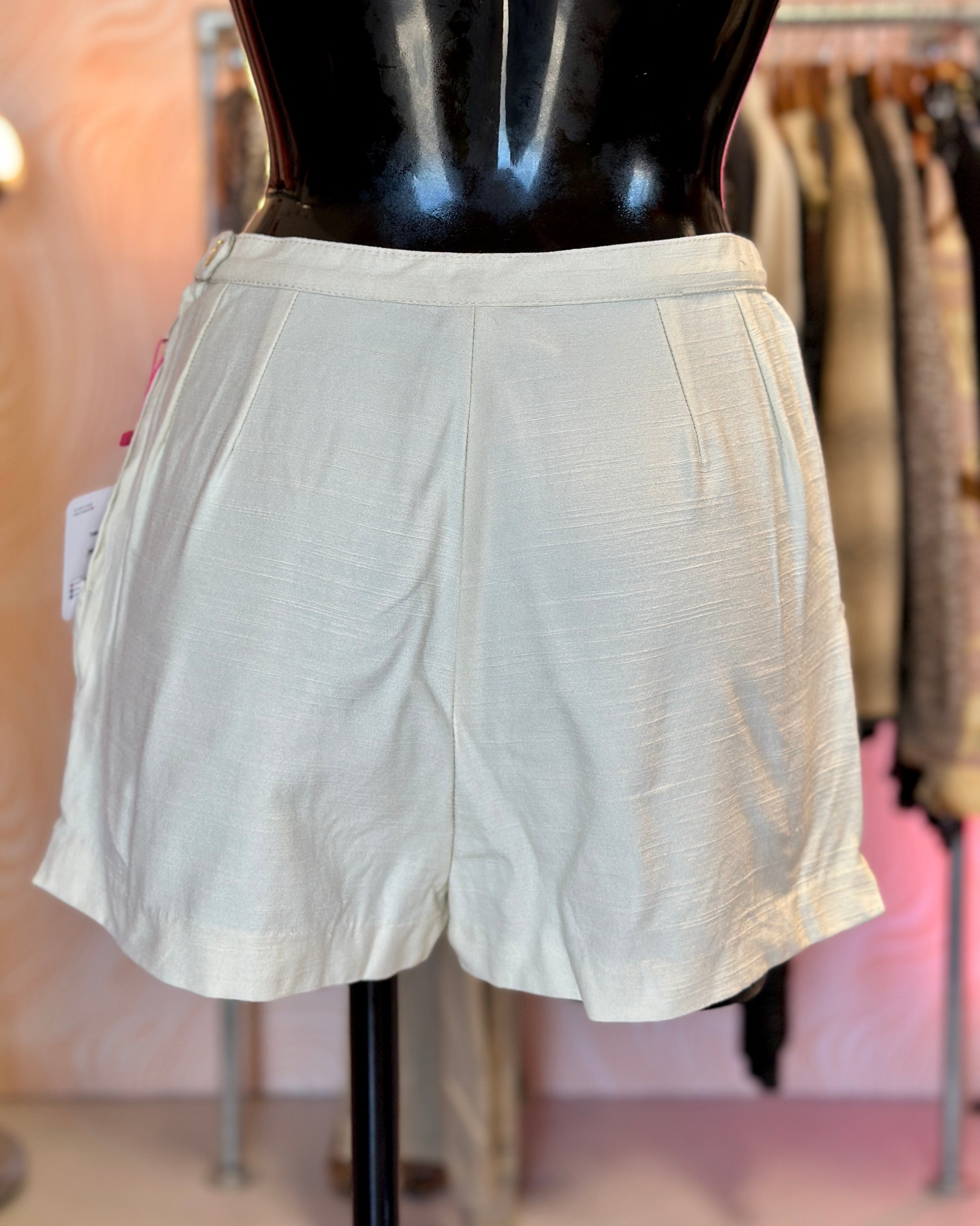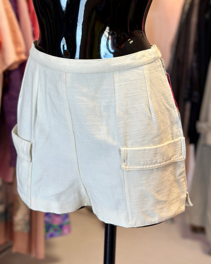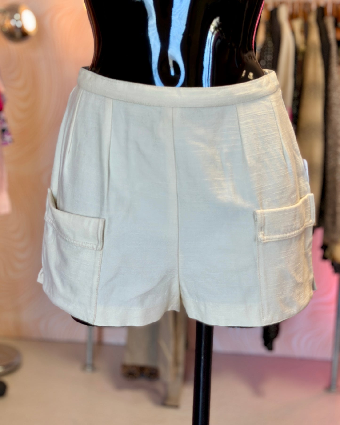 Mini short beige, avec fermeture sur le côté, deux poches devant.