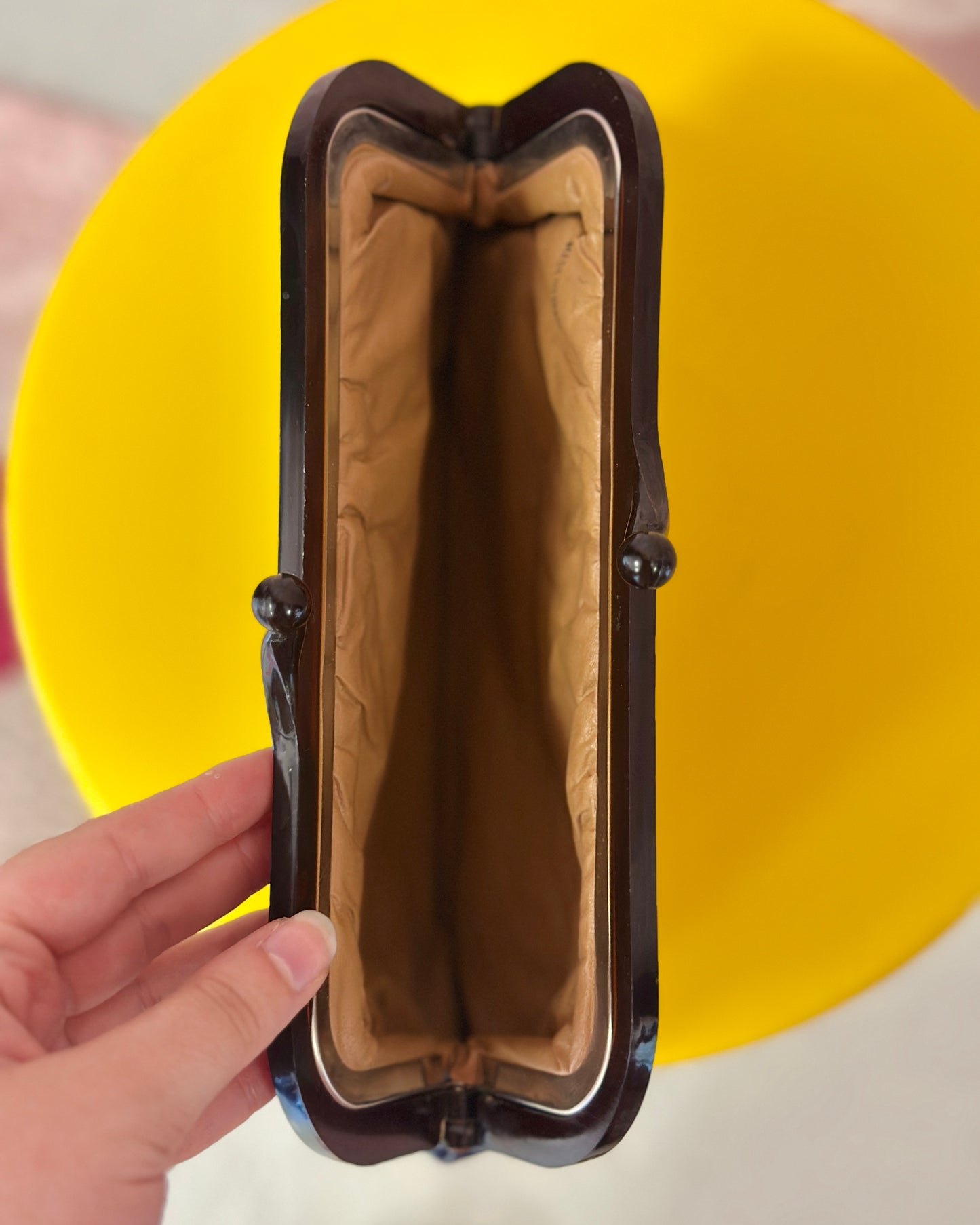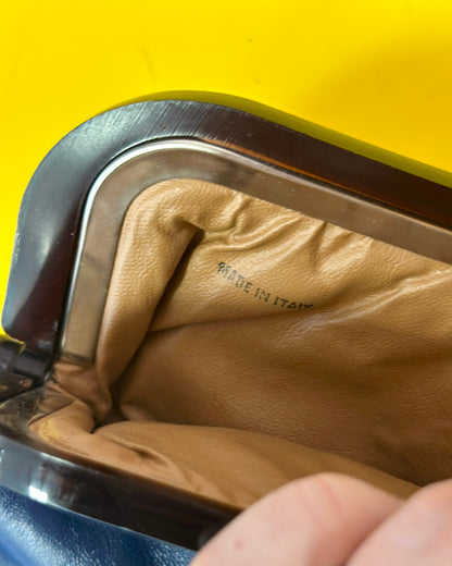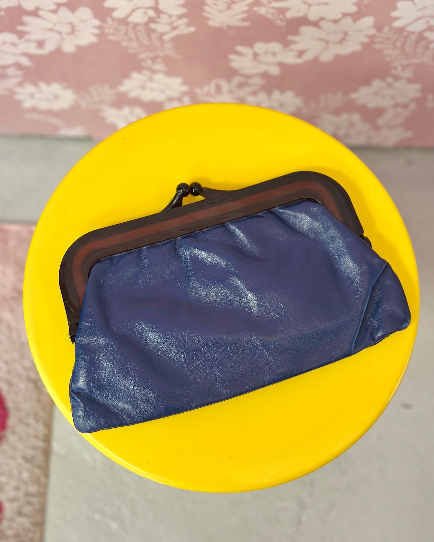 Pochette bleue en cuir avec fermeture en plastique marron.