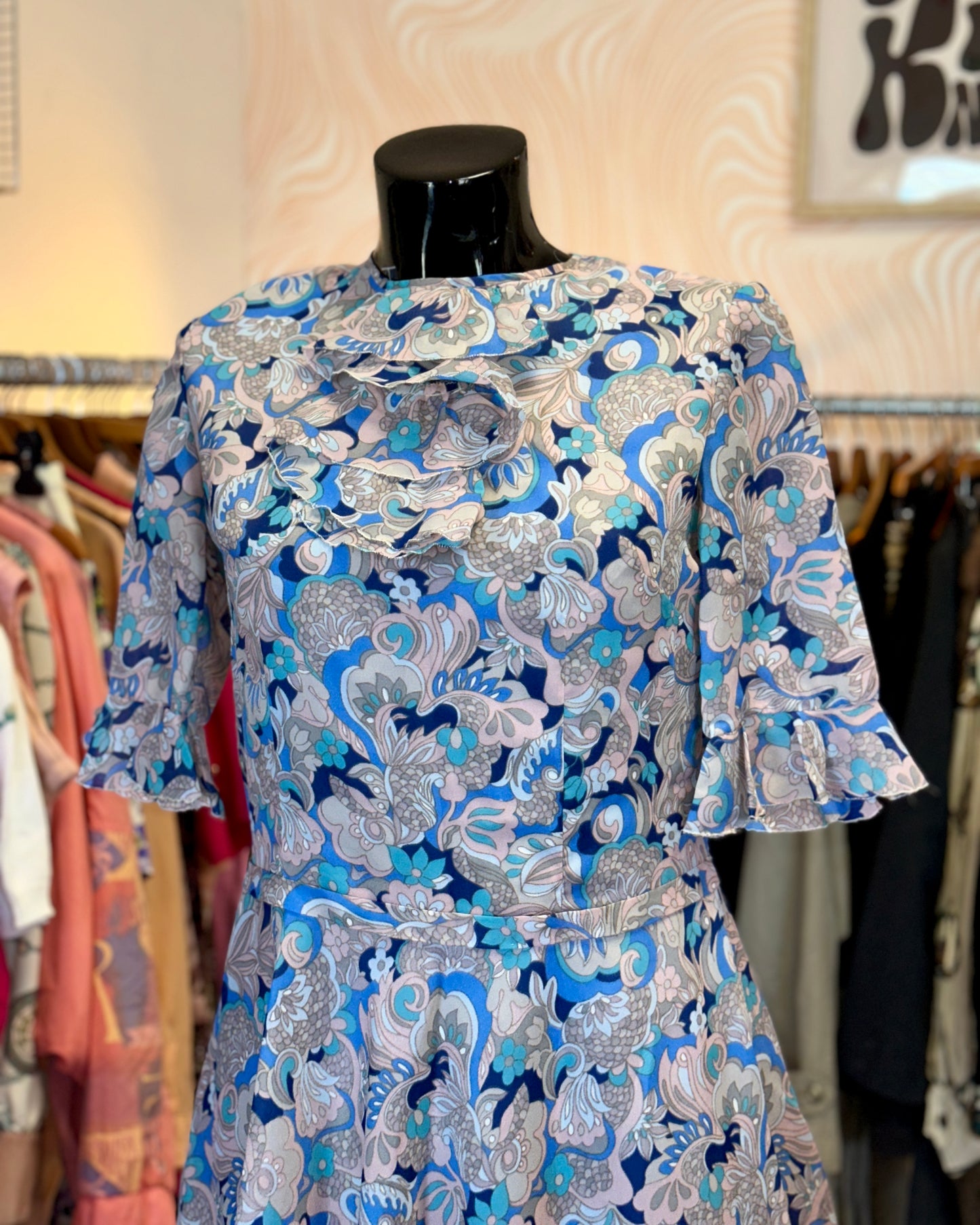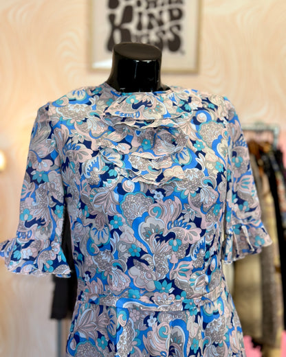 Robe courte fluide à motifs, avec un joli col à jabot.